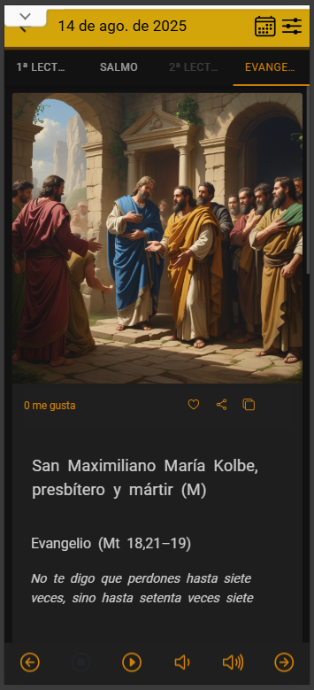 Accede a la versión web y podrás ver de un vistazo rápido las imágenes elegidas para el evangelio de hoy. También puedes ver todas las imágenes que se han utilizado en los evangelios, lecturas, jaculatorias y oraciones de días pasados sin más que pulsar en el icono flecha izquierda situado en la zona izquierda de la barra inferior de la pantalla de las lecturas del día: