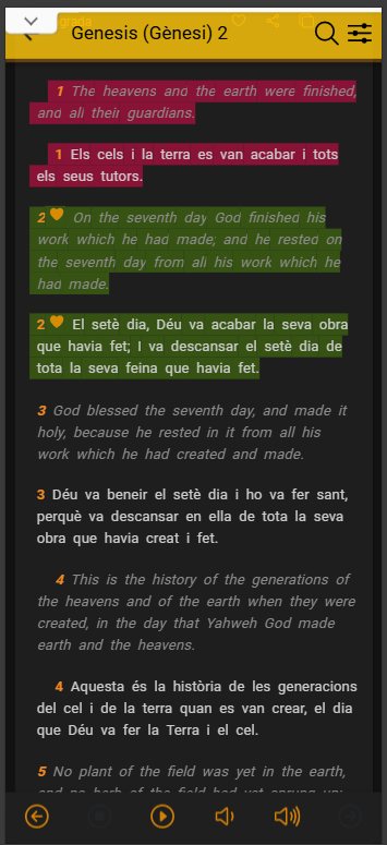 También, cuando escuches la Biblia por voz (pulsando sobre el botón play de la zona central inferior) se irán altaernando las voces en ambos idiomas (en el caso de la pantalla se irán alternando entre lectura del párrafo en inglés y la lectura del párrafo en español).
